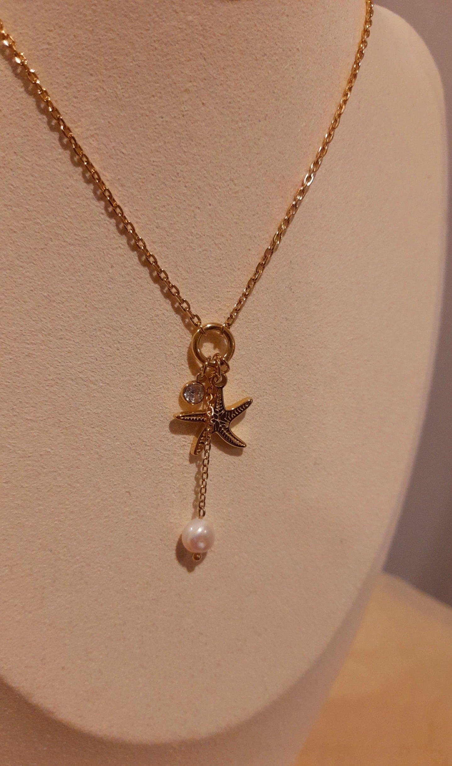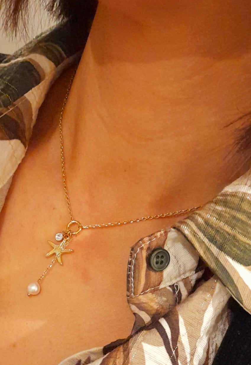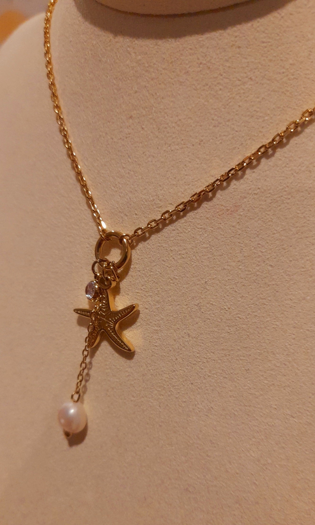 Ornements : étoile de mer, cristal taillé, perle d’eau douce