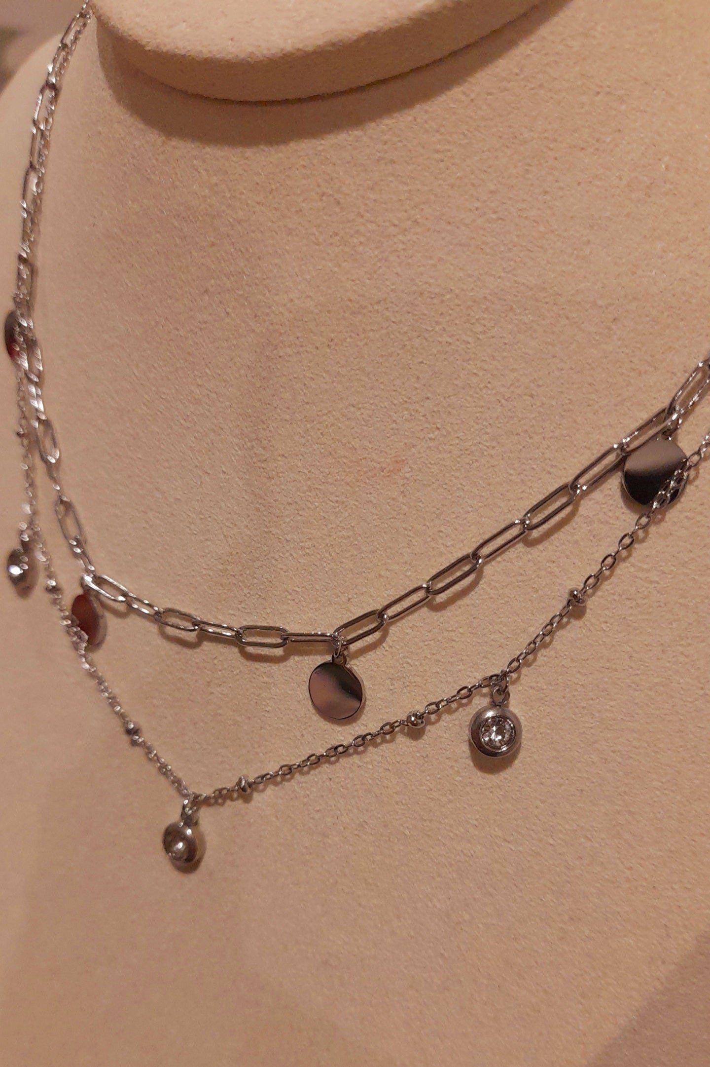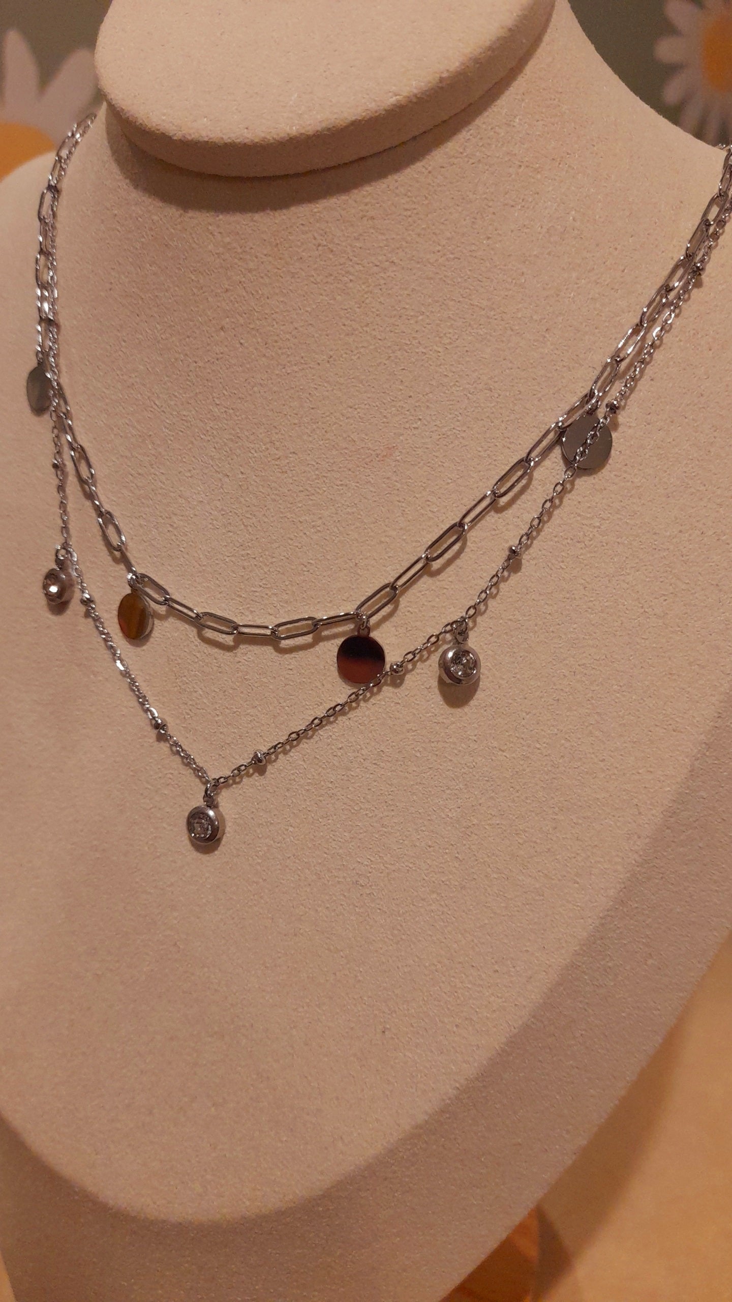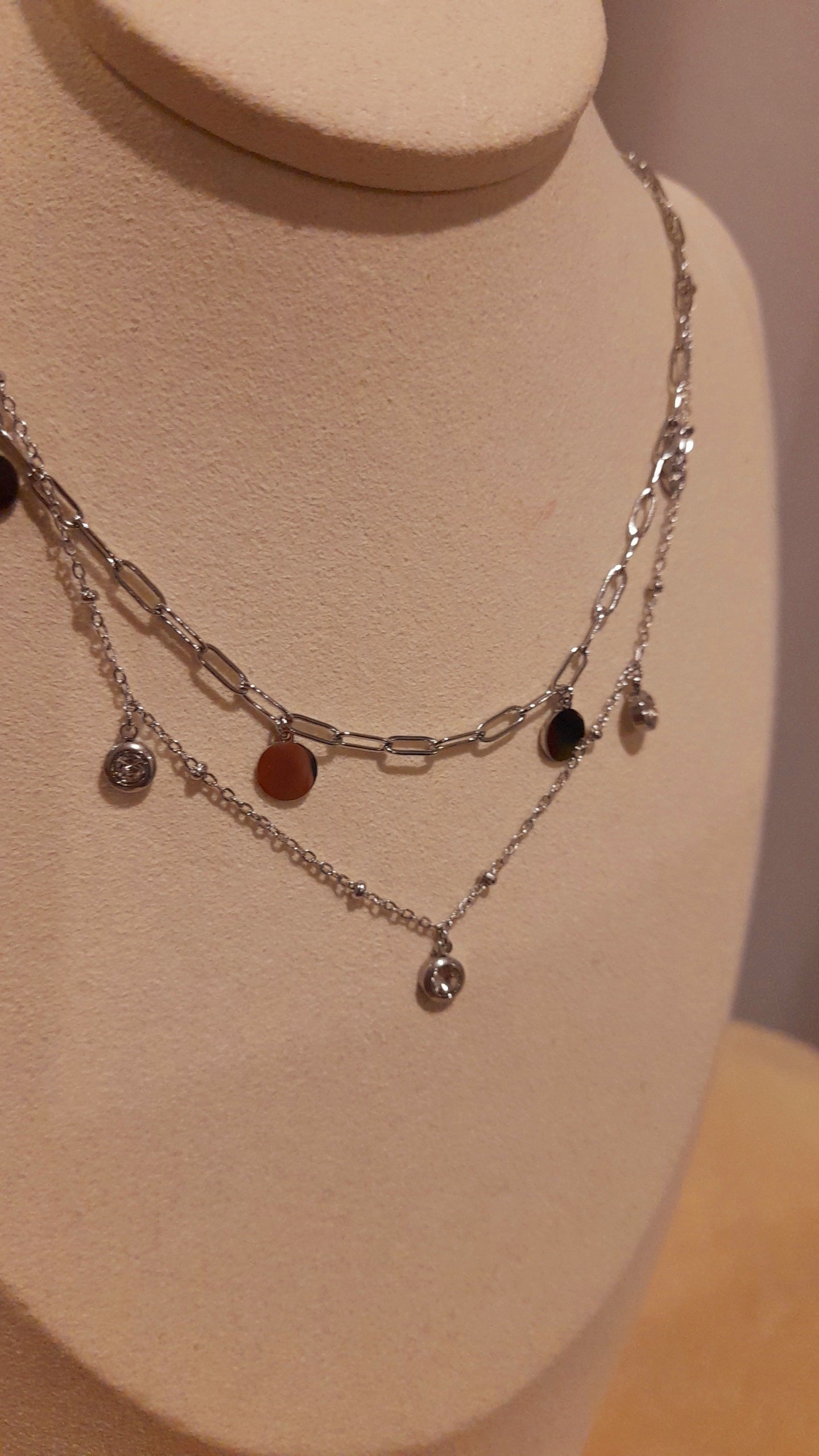 Apportez une touche élégante et raffinée à votre tenue avec le collier Nooréa argenté. Ce bijou multirangs est composé de deux chaînes en acier inoxydable, l’une ornée de boules en acier, l’autre d’une maille aux anneaux ovales décorée de pampilles rondes plates et cristaux. Son design moderne et lumineux crée un effet sophistiqué et captivant.