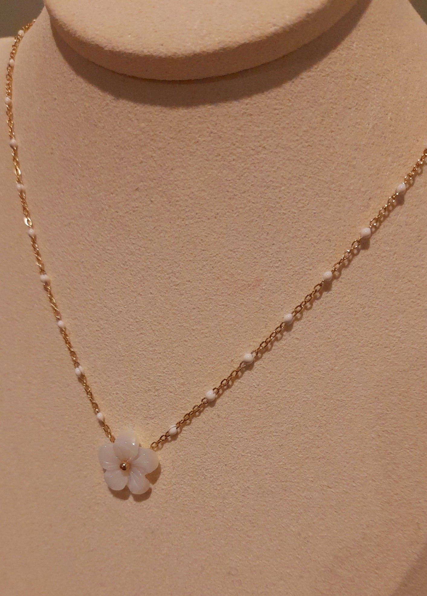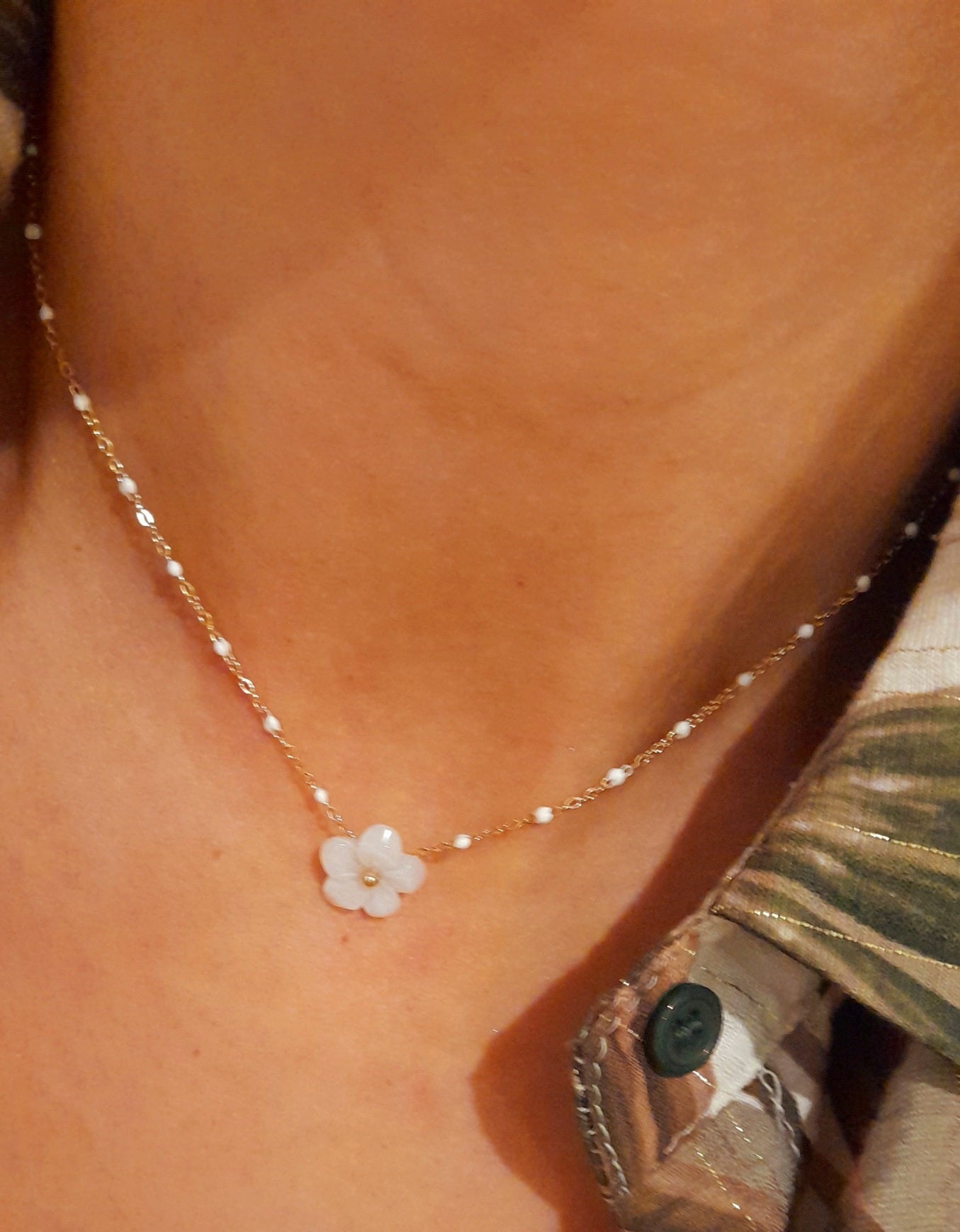 Apportez une touche féminine et raffinée à votre tenue avec le collier Élina. Ce bijou en acier inoxydable est composé d’une chaîne décorée de touches émaillées et d’un pendentif fleur nacrée, créant un effet poétique et lumineux.