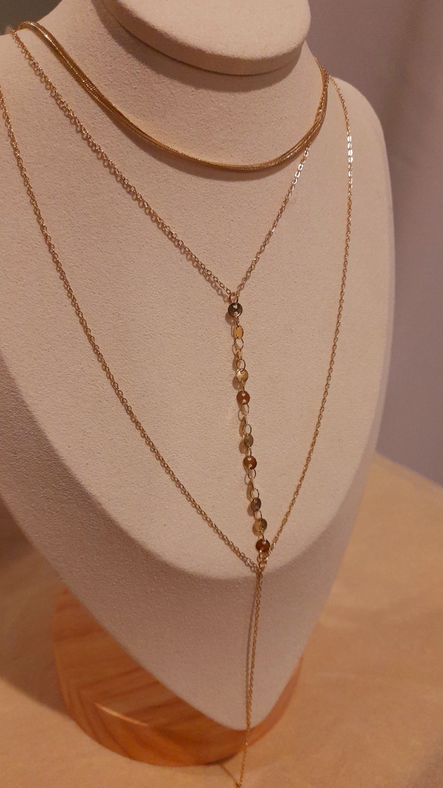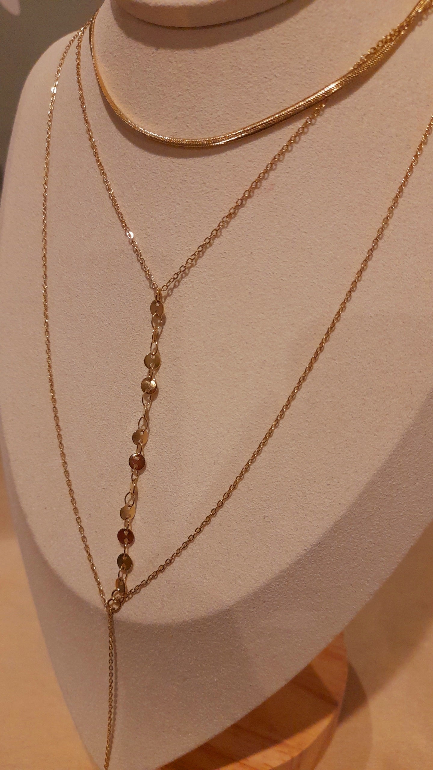 Les différents rangs créent un effet superposé raffiné, parfait pour porter seul ou en accumulation avec d’autres colliers, ajoutant originalité et lumière à toutes vos tenues.