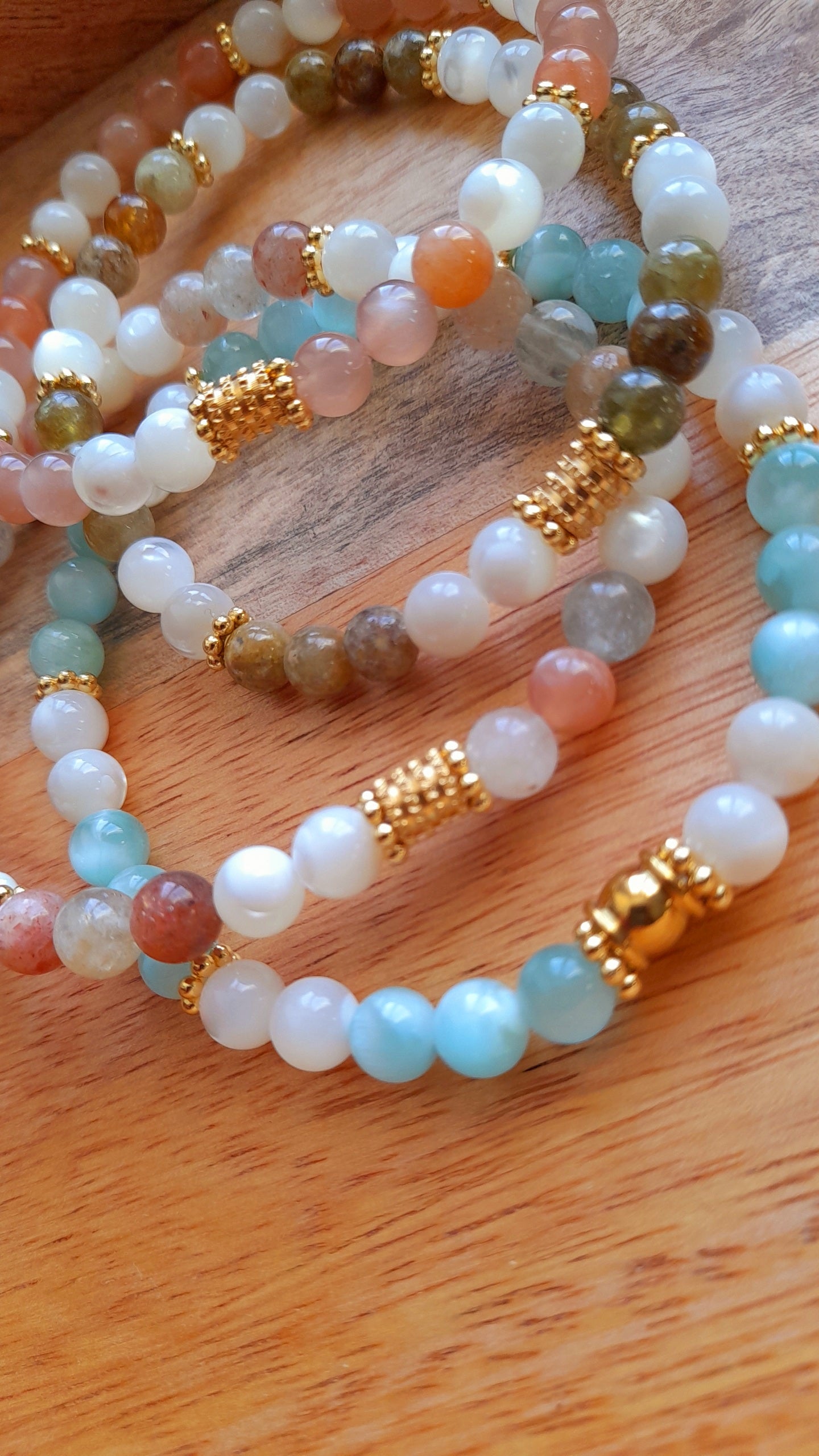 Ce bracelet unique de la collection Pierres et Merveilles crée par Limdéa, marie l'élégance douce de la nacre et la chaleur radieuse de la pierre du soleil. Chaque perle est minutieusement sélectionnée, réalisé à la main pour révéler la beauté authentique de ces matériaux naturels.