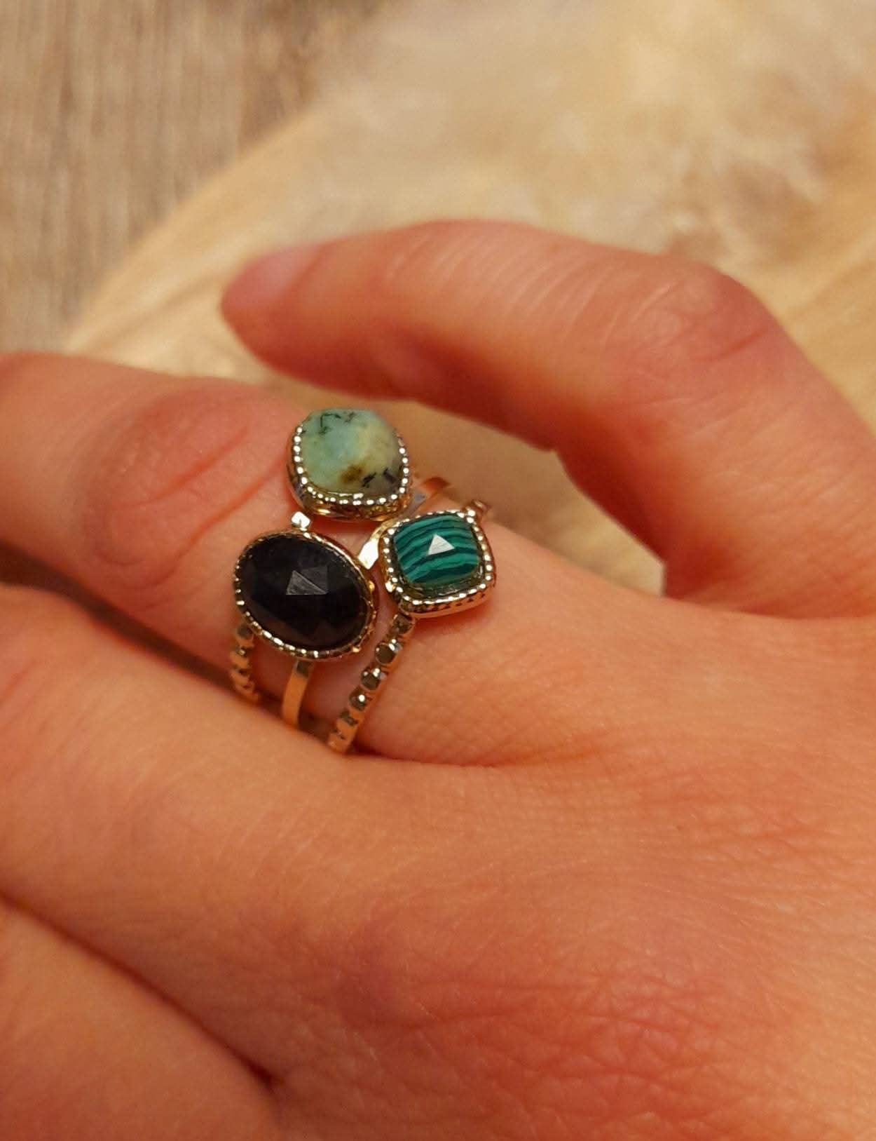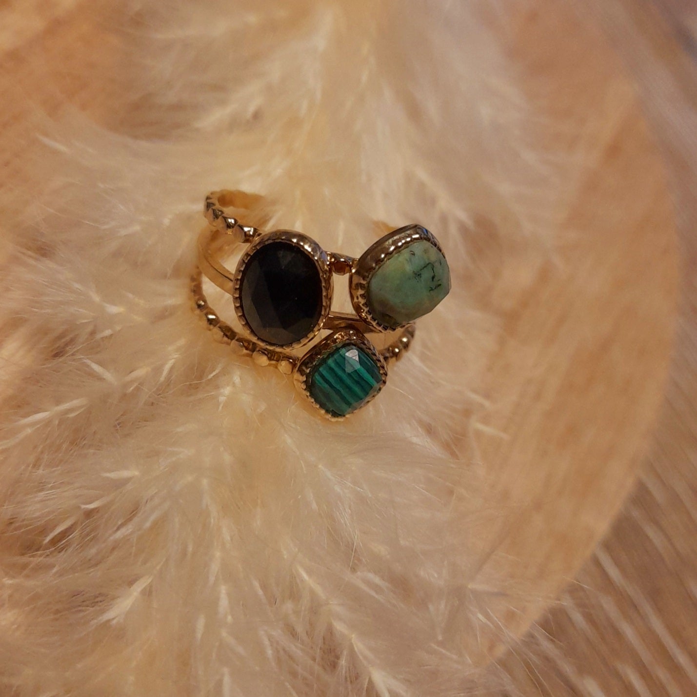 Chaque pierre naturelle est unique, avec des variations subtiles de formes et de couleurs qui témoignent de son authenticité et de sa singularité. Le design à trois anneaux effet milgrain met parfaitement en valeur les pierres tout en apportant texture et sophistication à votre doigt.