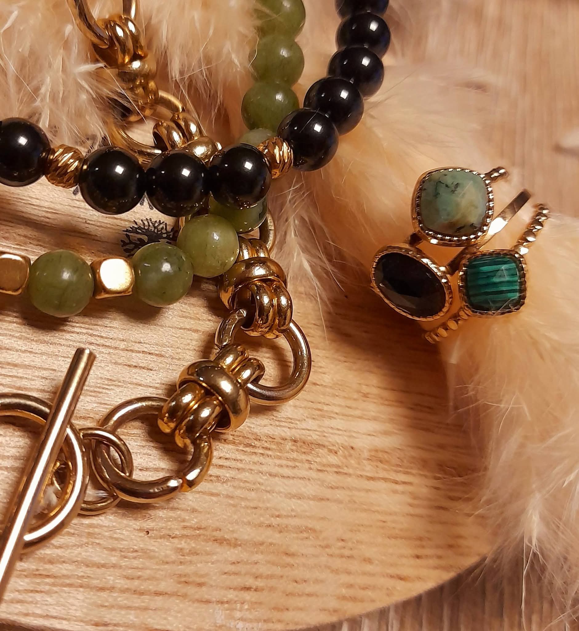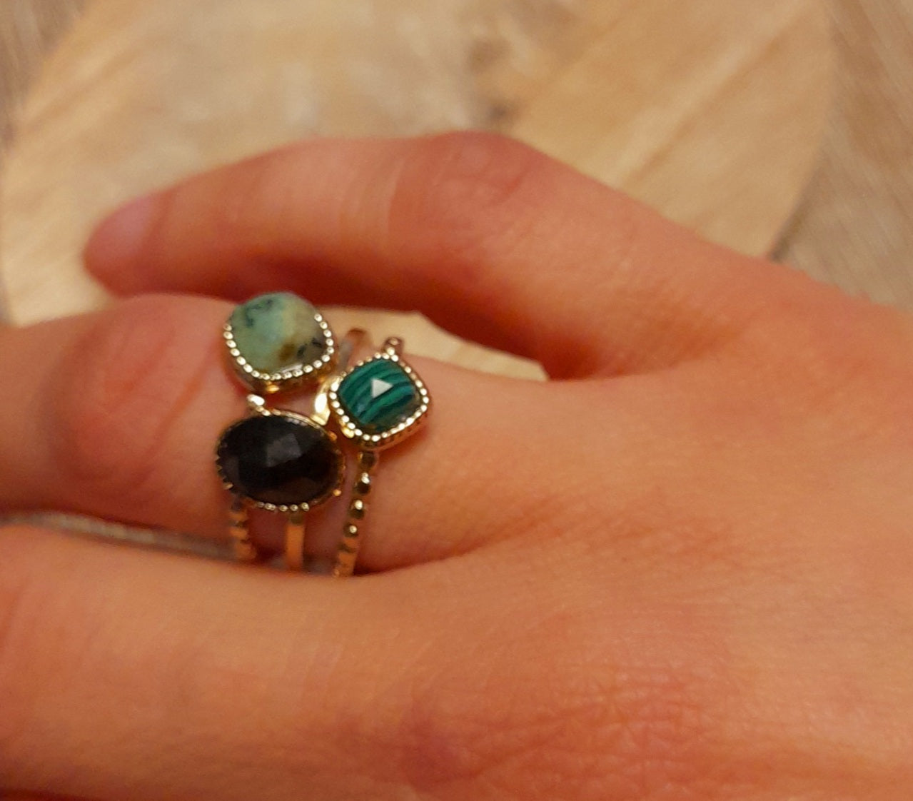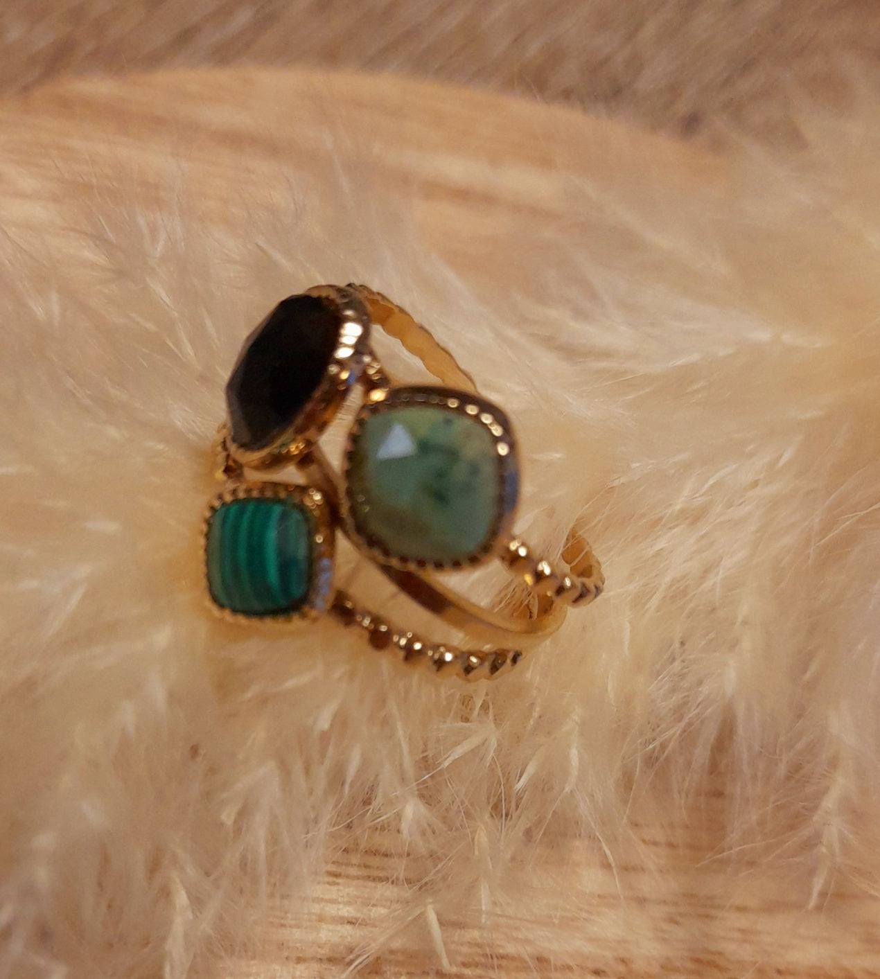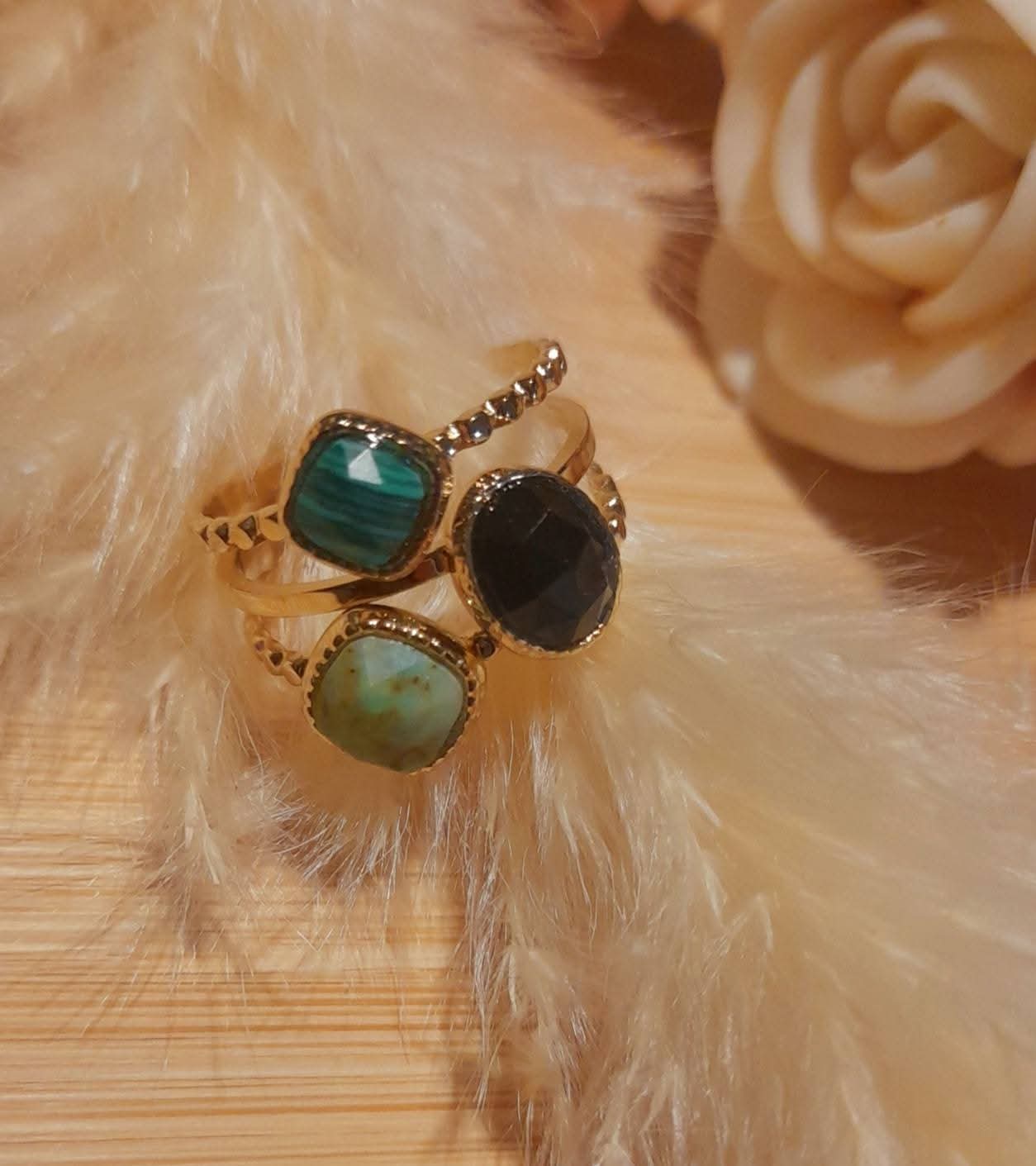 Élégante et originale, la bague Karys allie la modernité de l’acier inoxydable à la beauté naturelle des pierres Onyx, Turquoise Africaine et Malachite.