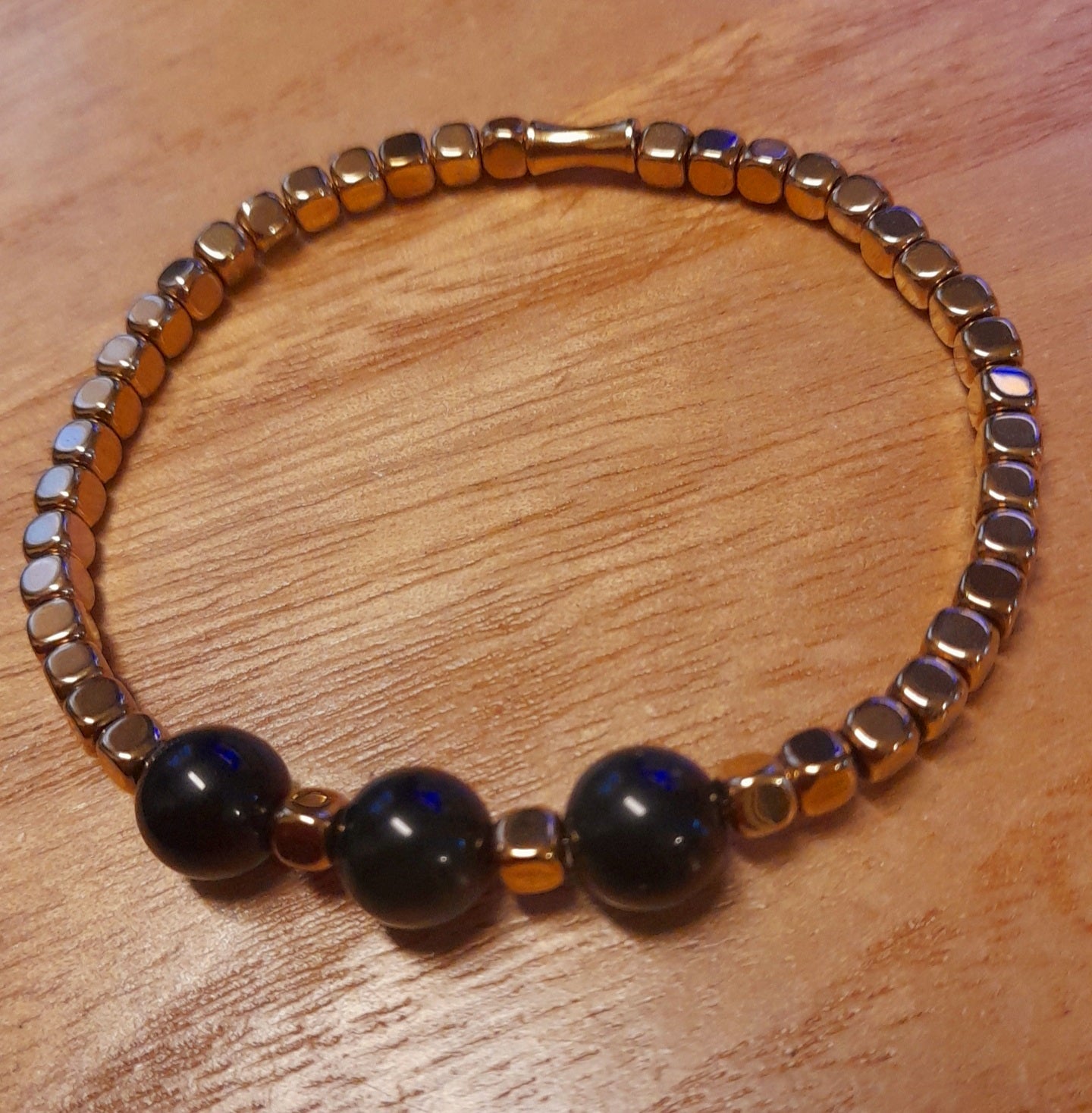 Monté à la main avec des perles d’obsidienne noire de 8 mm, symbole de protection et de vérité, et sublimé par des cubes d’hématite dorée de 4 mm, évoquant force, enracinement et énergie solaire, ce bracelet est un hommage à l’équilibre entre l’ombre et la lumière.