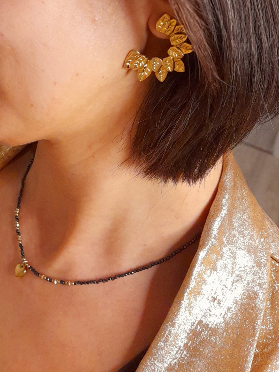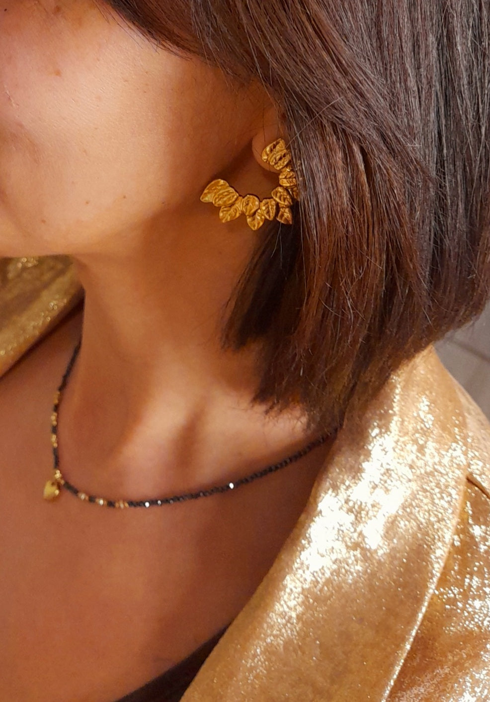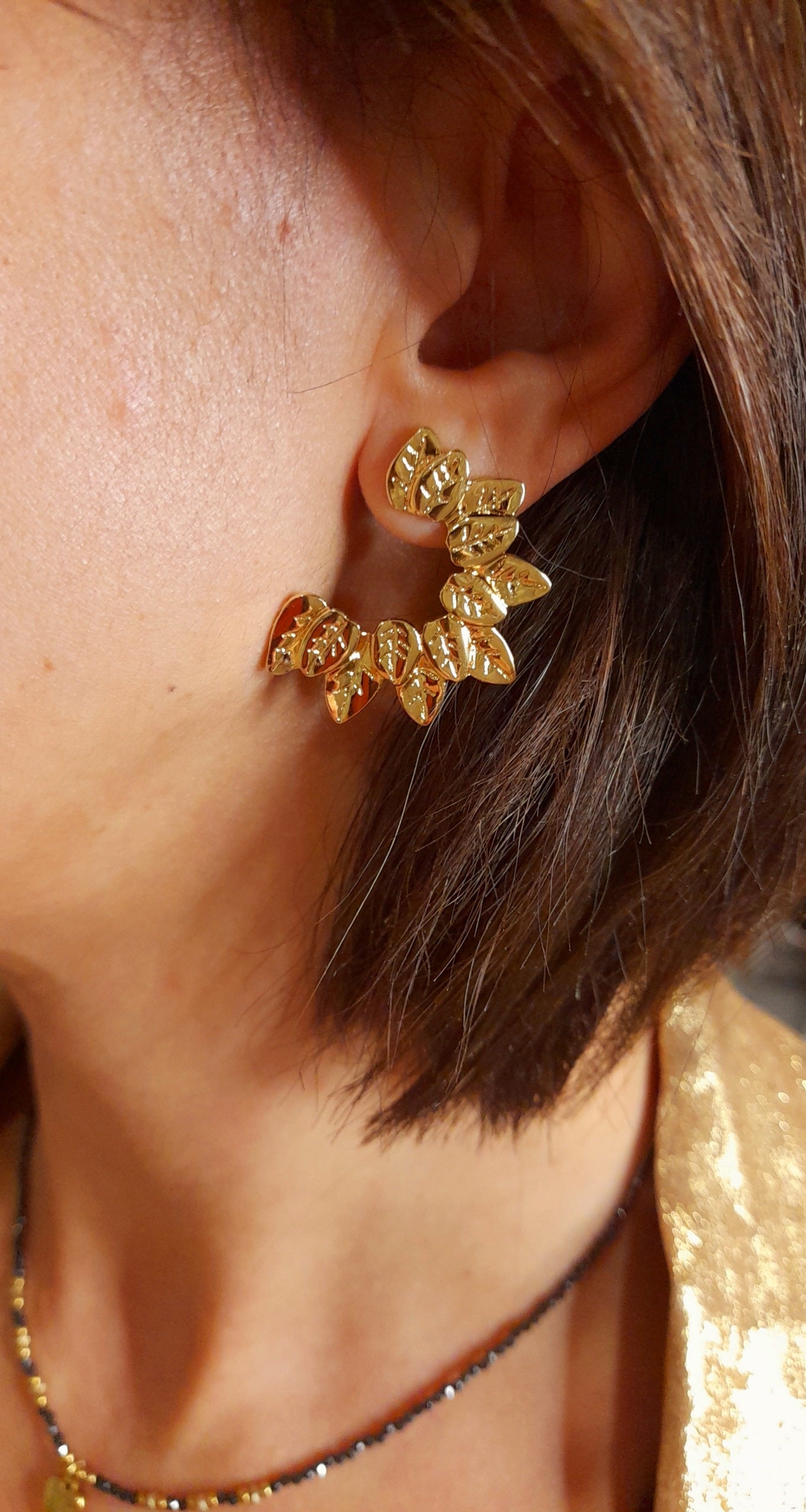 Les boucles d’oreilles LUCE se distinguent par leur délicate forme en demi-lune, ornée de petits motifs feuillagés qui s’entrelacent harmonieusement pour créer une silhouette douce et poétique. Leur design inspiré de la nature apporte une touche de fraîcheur et d’élégance, idéale pour sublimer le visage avec subtilité.