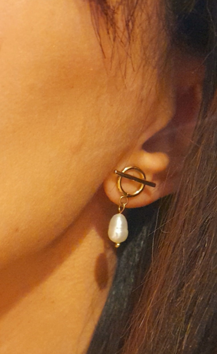 Apportez une touche d’élégance délicate avec les boucles d’oreilles Zahraë. Ces puces en acier inoxydable allient minimalisme et raffinement, avec un anneau et une barre délicatement accompagnés d’une perle d’eau douce pendante, pour un bijou sublime et féminin.